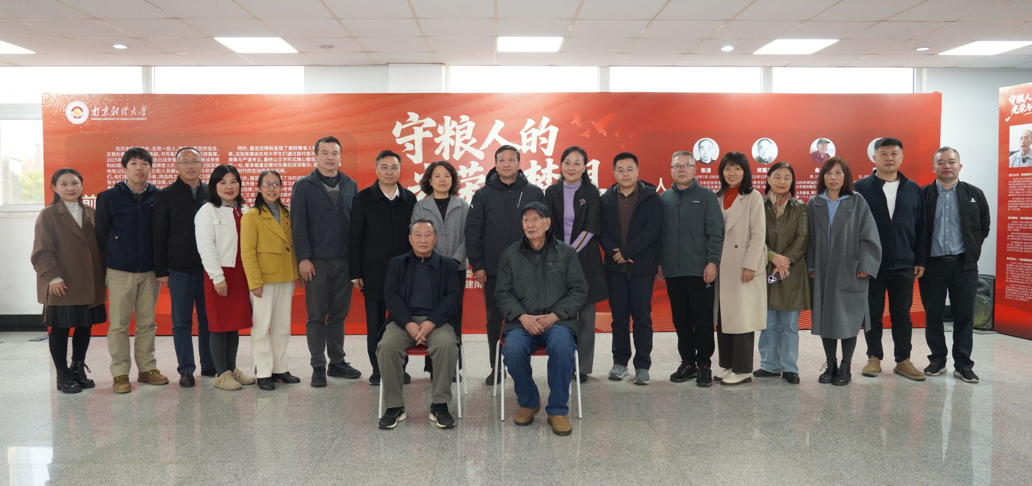展览通过珍贵历史影像、口述访谈视频及战时实物档案,集中展示了原粮食部南京粮食学校校长张清、老党员吴秋月,原南京粮食经济学院党委书记郑翼云、院长牛振江、粮食经济系负责人王焕炜、校医许绮霞、离休教授俞寿颐,原江苏财经高等专科学校人事处处长刘树铭等老一辈南财人从烽火岁月到育人讲台的奋斗故事。他们既是保家卫国的战士,也是我国粮食事业与高等教育发展的奠基者。两位八旬高龄“守粮人”王焕炜、刘树铭进行现场宣讲,结合自身经历为师生生动讲述了那段峥嵘岁月。